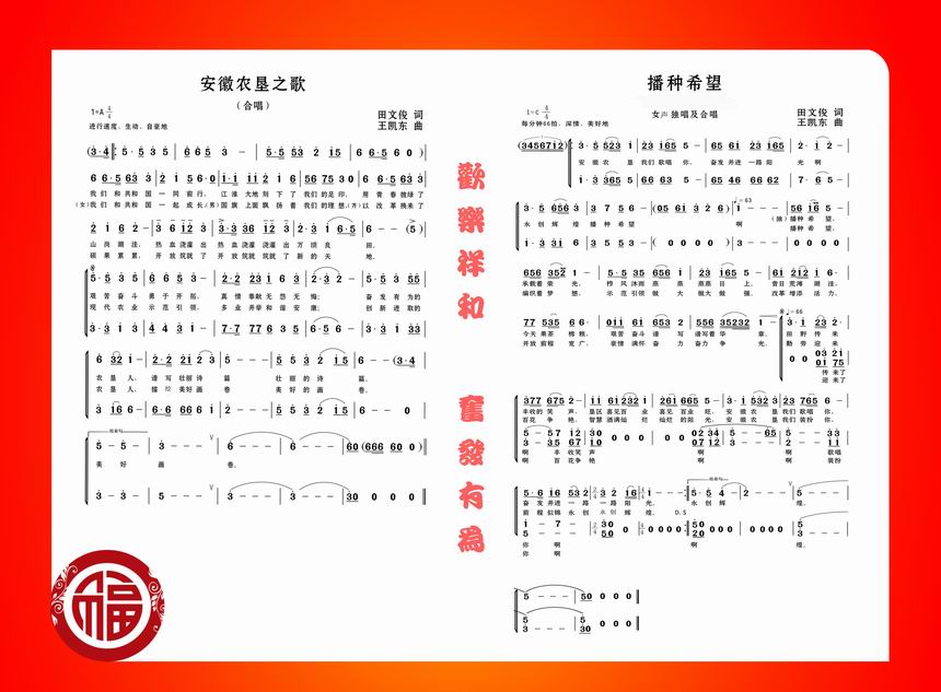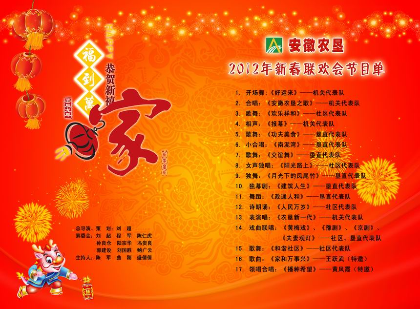 聯歡會在一曲歡快的《好運來》歌舞中拉開帷幕,隨后,集團公司領導班子全體成員及部分處室負責人在作曲家王凱東先生的指揮下演唱了為農墾創作的《安徽農墾之歌》,熱烈奔放,慷慨激昂,表達了13萬農墾人奮發向上的心聲。機關、墾直和社區三個代表隊分別為聯歡會呈現上精彩紛呈的節目,體現了本次聯歡會“歡樂祥和,奮發向上”的主題。相聲《報幕》為聯歡會帶來了陣陣笑聲。歌曲《陽光路上》謳歌了農墾人的幸福生活。詩朗誦《人民萬歲》激昂頓挫,表達了對第一代共和國領袖的敬仰。表演唱《農墾新一代》展示了農墾新生代的青春風采。戲曲聯唱唱出了中華傳統文化的精髓。聯歡會特邀安徽省歌舞團團長王躍武先生深情演唱了《家和萬事興》和《左鄰右舍》,精彩的演唱贏得了陣陣掌聲。安徽省著名歌唱家黃鳳霞領唱的《播種希望》展現了農墾奮發有為、充滿希望的廣闊前景,聲情并茂的演唱將聯歡會推向了高潮。