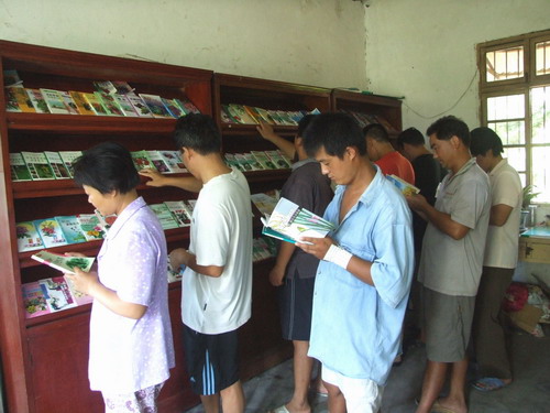 龍亢農場作為國家社會主義新農村建設的聯系點,充分發揮科技帶動作用,將農業部贈予的400冊科技種、養殖圖書擺上農場閱覽室的書架上,并將科技實用書的目錄印發給職工及周邊的農民。圖為職工和周邊農民在借閱圖書。
