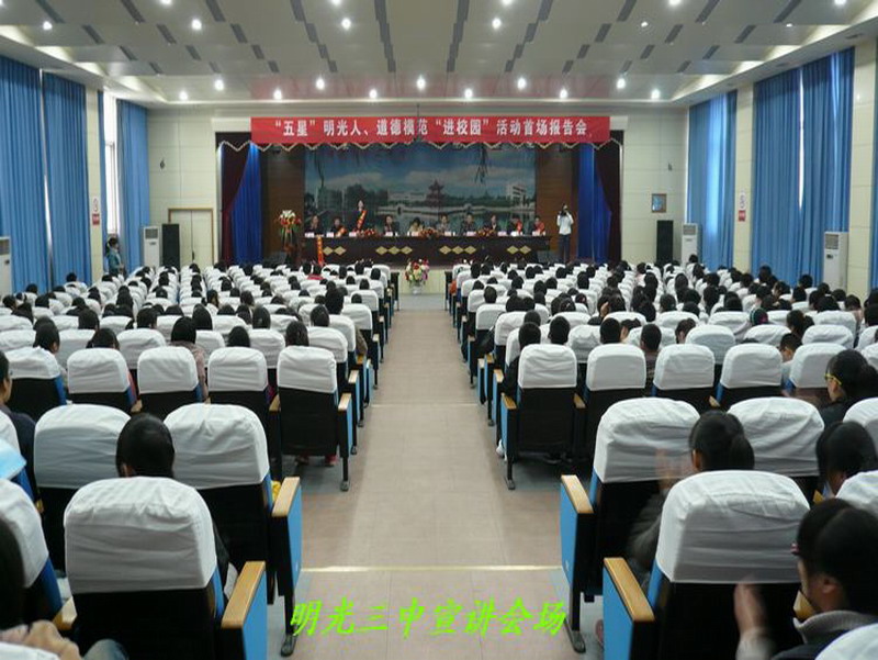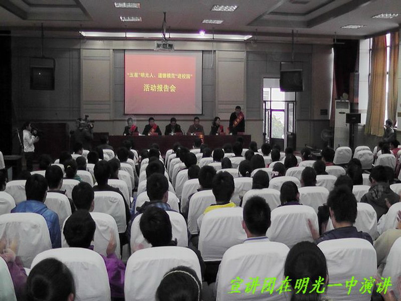 明光市委常委、宣傳部長楊文萍出席首場宣講會并作講話。她說,為了加強思想道德建設,弘揚明光道德模范的先進事跡,在全市營造良好的社會風氣,我們舉辦第一屆“五星”明光人、首屆道德模范“進校園”活動,力求通過身邊人、身邊事教育影響全市人民,引導人們摒棄不文明、不道德的行為;同時通過家庭教育、學校教育、社會教育相結合的辦法感動下一代,為中學生做一次心靈洗禮,促使他們健康成長、早日成才。