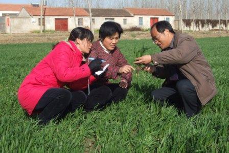 為降低小麥良種遭受凍害風險及紋枯病的發生,3月5日,安徽農墾龍亢農場組織農技人員深入田間地頭現場指導科學田管。圖為農場農業專家許化武(右一)在十分場職工邵志芬良種田地里查蟲并指導.