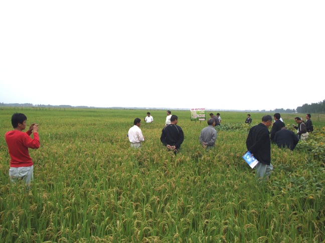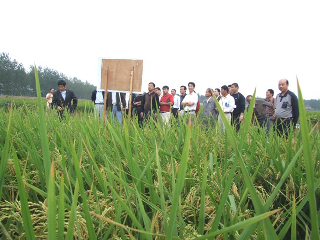 觀摩團一行深入龍亢農場“綠旱一號”試驗田、生產示范田進行實地觀摩,聽取了該品種水稻的生長特性的介紹,并現場觀摩該品種的長勢及表現,并經現場測產核實,“綠旱一號”平均畝產達550
