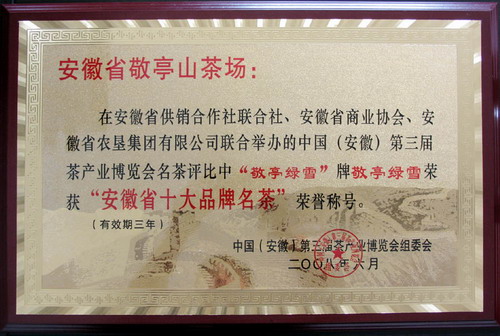 敬亭綠雪在中國(安徽)第三屆茶產業博覽會上榮獲“安徽省十大品牌名茶”稱號