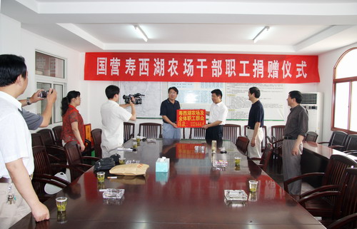 5月14日,場黨委和工會發出開展抗震救災捐款活動的召開后,全場迅速掀起了捐款活動的高潮,截至21日,已有26個單位2137名職工群眾參與了捐贈活動,共募得人民幣112444.2元。其間,壽西湖飯店、壽西湖農場水泥廠等場區單位和個私企業的職工直接向地方紅十字會和民政部門捐贈人民幣2萬多元。目前,農場的捐款活動仍在繼續進行。22上午,經認真統計核準后,壽西湖農場將首次捐賑的112444.2元現金轉贈壽縣民政局賑災部門,已由他們匯往四川災區。