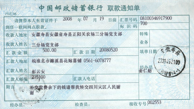 5月21日,安徽農墾正陽關農場三分場黨支部收到一張匯款單,匯款金額500元人民幣,匯款地址為淮北市濉溪縣,匯款人彭云安。匯款人留言:“補交黨費余下的錢請幫我轉交四川人民災區 謝謝”。