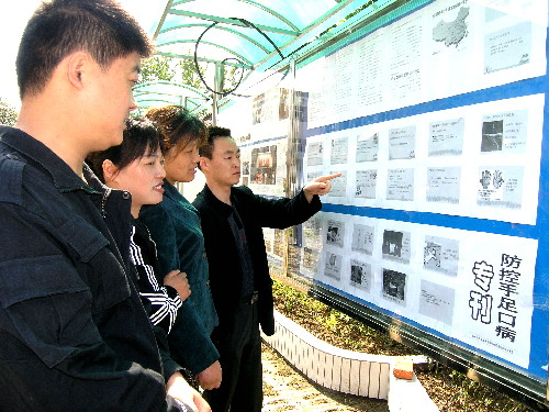 5月13日上午,在安徽省潘村湖農場場部宣傳欄前,幾名職工群眾正在駐足觀看“防控手足口病??薄_B日來,該場通過廣播、內刊、櫥窗等形式集中宣傳普及手足口病防控知識,受到群眾歡迎。(楊登宏攝)