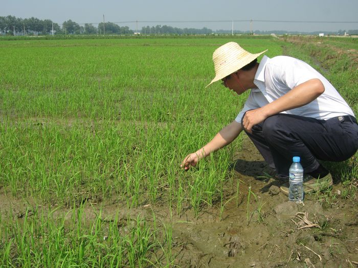 8月3日上午,皖河農場中聯分場一農工正在補插的秧田里噴施農藥,農場農業科科長錢學文帶著2名農技人員在地頭察看苗情,檢查蟲情,及時提出災后生產管理和技術措施。