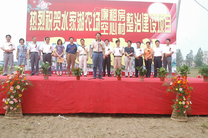 場長朱為榮在致辭中表態,農場將舉全場之力,精心組織,多方協調,加強監管,攻堅克難,確保項目實施順利推進,打造人民滿意、領導放心、社會認可的精品工程;建設方代表劉會滿在致辭中對工程質量、建設工期、安全生產進行了鄭重承諾;集團公司副總經理劉超對水家湖農場搶抓機遇、迅速啟動、在沿淮農場打響廉租住房建設第一槍致以熱烈祝賀,要求水家湖農場認真建立并嚴格落實工程質量管理責任制,以一流的工作作風、強烈的工作事業心和高度的政治責任感,全力以赴,加快進度,保證質量,接受監督,把廉租住房建設好。