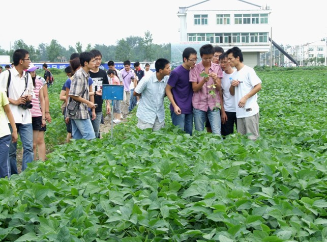 觀摩團分別參觀了龍亢農場現代農業高科技示范園、農田大豆長勢及病蟲害防治情況,聽取了龍亢農場現代農業建設和作物植保工作情況介紹,與農場農科所的技術人員重點交流了小麥、大豆、水稻等作物主要病蟲草害的防治措施和技術要領。