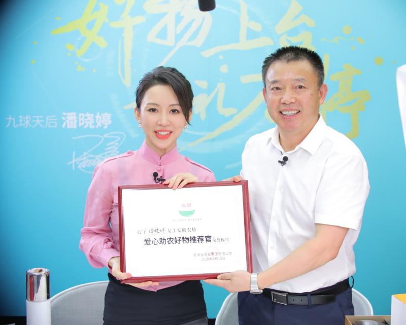 6月13日,“九球天后”潘曉婷在抖音平臺進行了個人直播首秀,農墾集團公司副總經理董建平做客直播間介紹安徽農墾集團和皖墾品牌情況,向潘曉婷女士贈送了敬亭綠雪茶葉,并向其頒發了“愛心助農好物推薦官”證書。集團公司戰略發展部負責人在直播間同潘曉婷女士一同向廣大網友粉絲推介皖墾優質農產品。