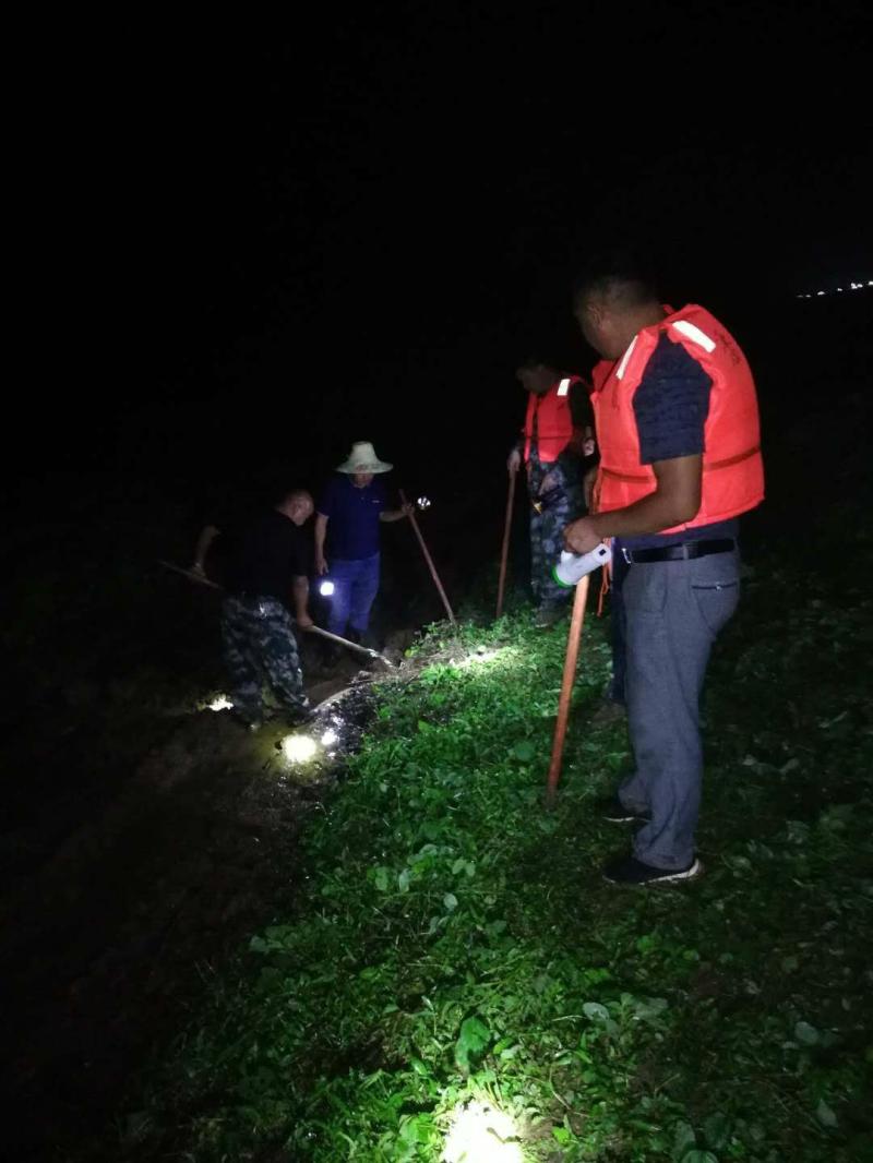 天已經(jīng)完全黑下來(lái)了,堤壩上燈影搖曳,紅旗獵獵。20名隊(duì)員迎著夾帶著原野芬芳的晚風(fēng),一手拿著木棍或鍬锨,一手拿著高光手電筒,在長(zhǎng)200米,寬約50米的范圍內(nèi)一字排開(kāi),“地毯式”仔細(xì)排查管涌、滲漏、塌方等堤防隱患。