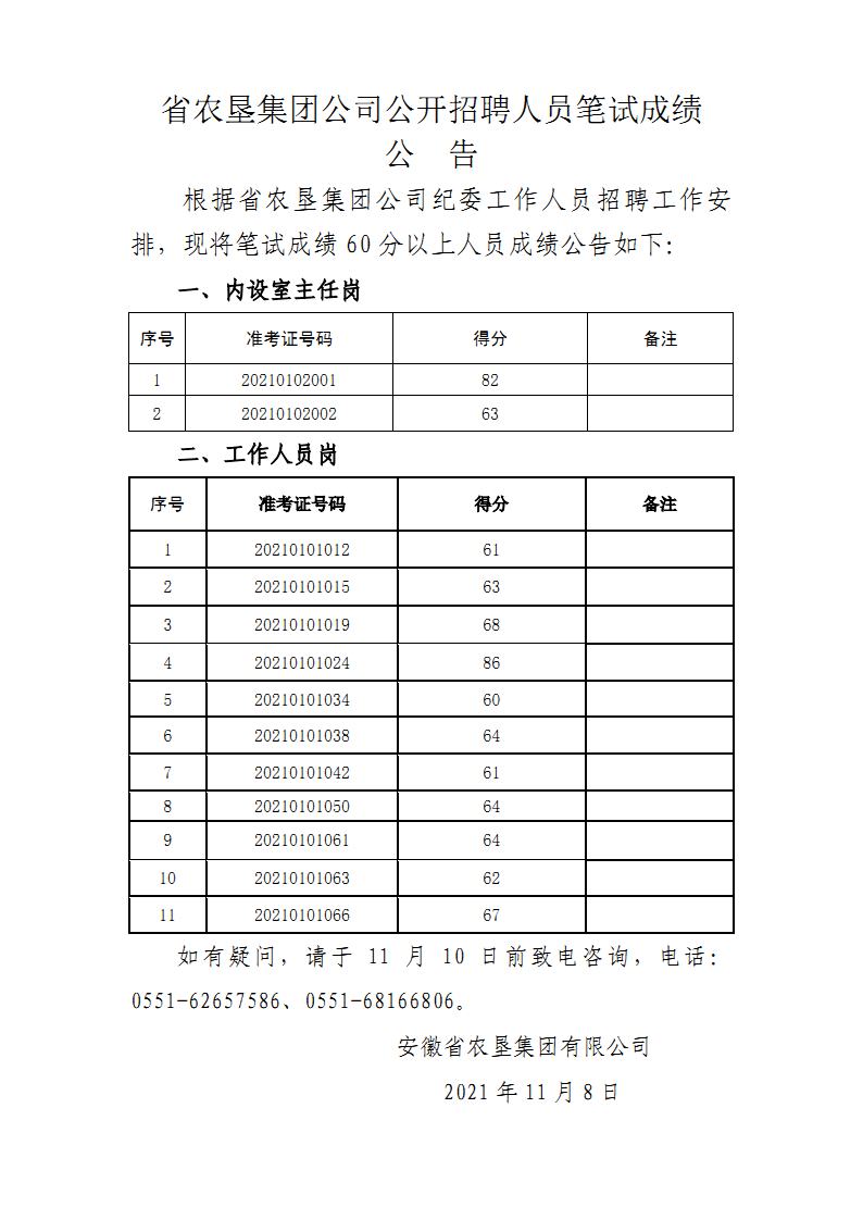 省農墾集團公司公開招聘人員筆試成績公告