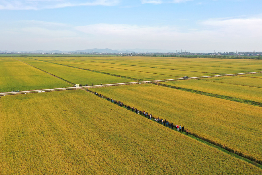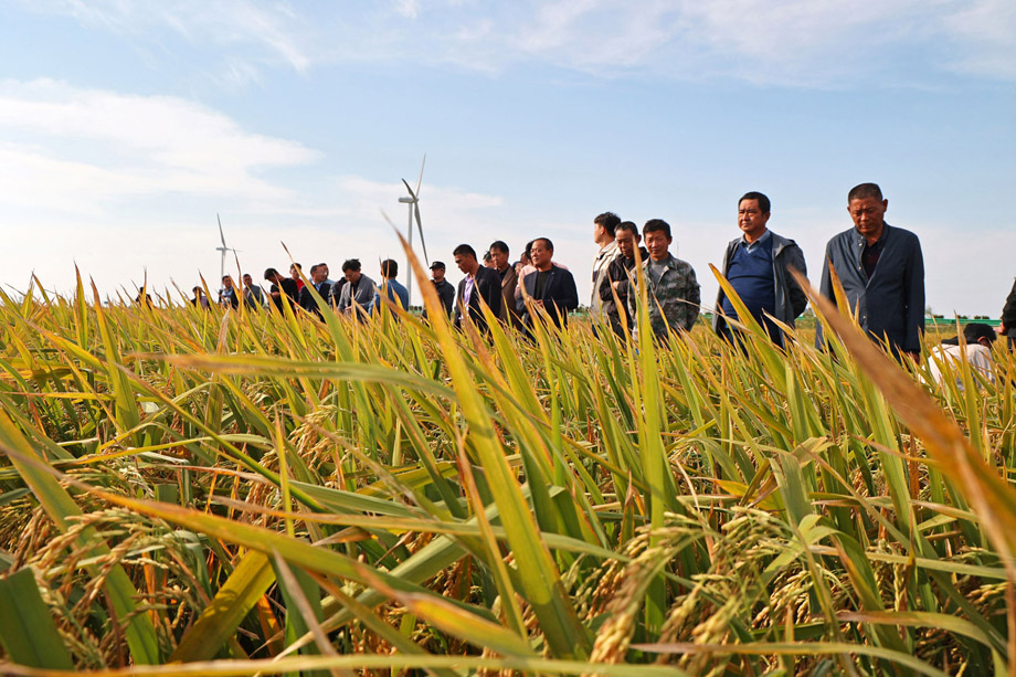 10月10日,華陽河農(nóng)場(chǎng)公司組織種糧大戶、農(nóng)技人員和社會(huì)化服務(wù)單位等近百人,到農(nóng)場(chǎng)統(tǒng)一經(jīng)營高產(chǎn)示范田觀摩成熟期水稻的生長情況。