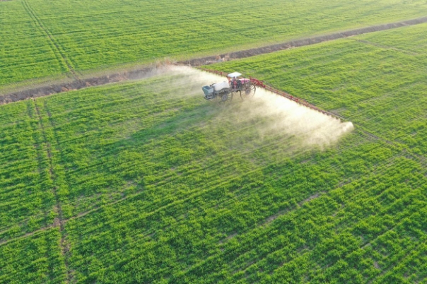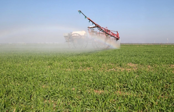 2月16日,華陽河農場農機手駕駛大型植保機械進行小麥噴肥施藥作業。(李龍 攝)