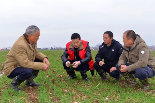 2月23日,農業技術員深入田地查看苗情,實地開展春季田管技術指導服務(薛曉旭 攝)