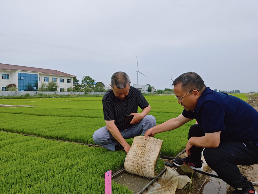 華陽河農場水稻育秧現場,農科所技術人員正在查看秧苗扎根生長情況。包丹鳳 攝