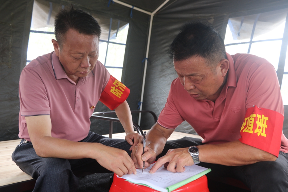 皖河農場防汛人員對巡堤查險情況進行登記。徐麗燕 攝