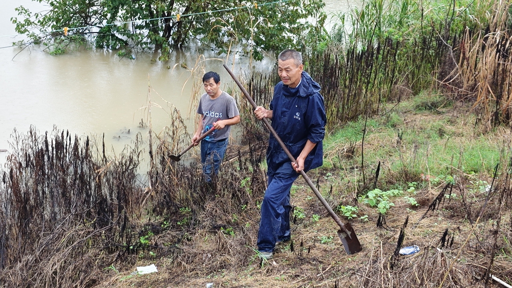 茶業集團防汛人員在巡堤查險。俞小龍 攝