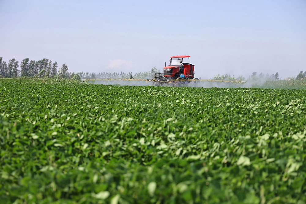 7月7日,華陽河農(nóng)場公司第二農(nóng)業(yè)分場的統(tǒng)一經(jīng)營田里,農(nóng)機手駕駛高架寬幅噴桿打藥機進行大豆噴肥施藥作業(yè)。李龍 攝