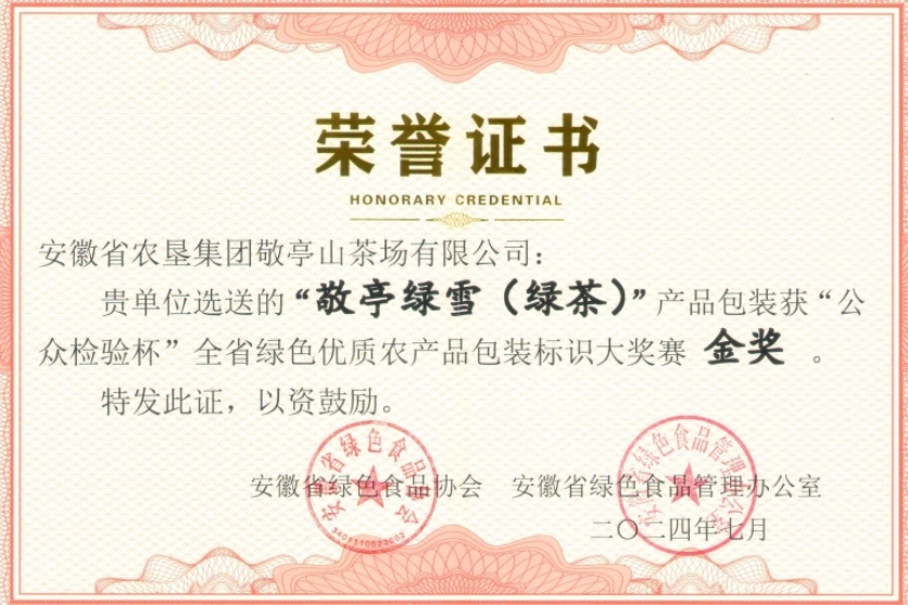 7月16日,由安徽省農業農村廳指導,安徽省綠色食品協會與安徽省綠色食品管理辦公室聯合主辦的公眾檢驗杯全省綠色優質農產品包裝標識大獎賽頒獎典禮在合肥舉行。敬亭山茶場公司選送的“敬亭綠雪”(綠茶)產品包裝榮獲大獎賽金獎。
