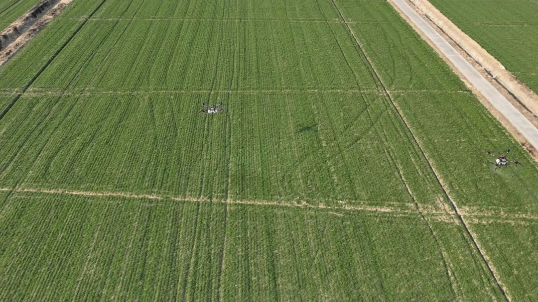 2月28日,在安徽農(nóng)墾龍亢農(nóng)場農(nóng)業(yè)二場4號地塊,兩架無人機正在進(jìn)行小麥雨前追肥作業(yè)。今年該場2.2萬畝小麥全部實行無人機施肥。