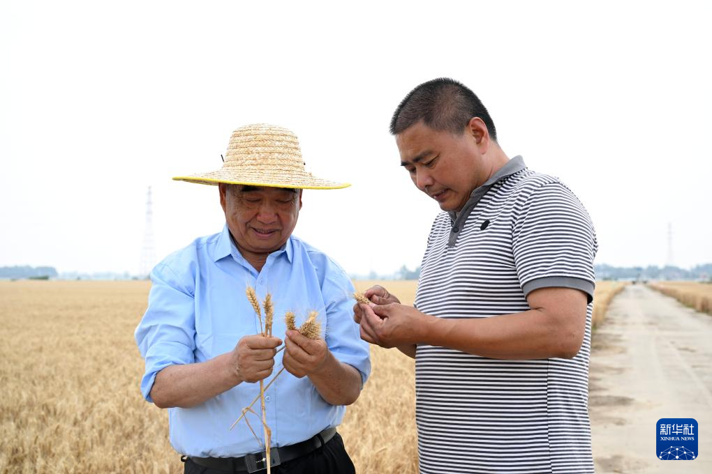 5月28日,徐淙祥(左)在阜陽市太和縣舊縣鎮(zhèn)的田間和種糧大戶交流小麥的成熟情況。