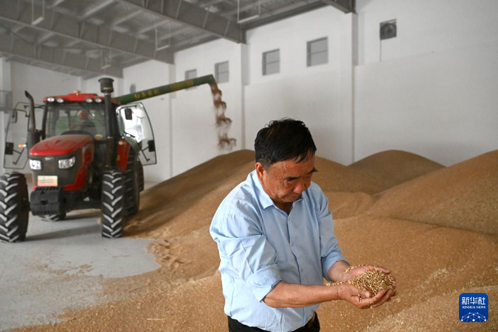 5月28日,徐淙祥在太和縣淙祥農(nóng)事服務中心察看收獲的小麥。