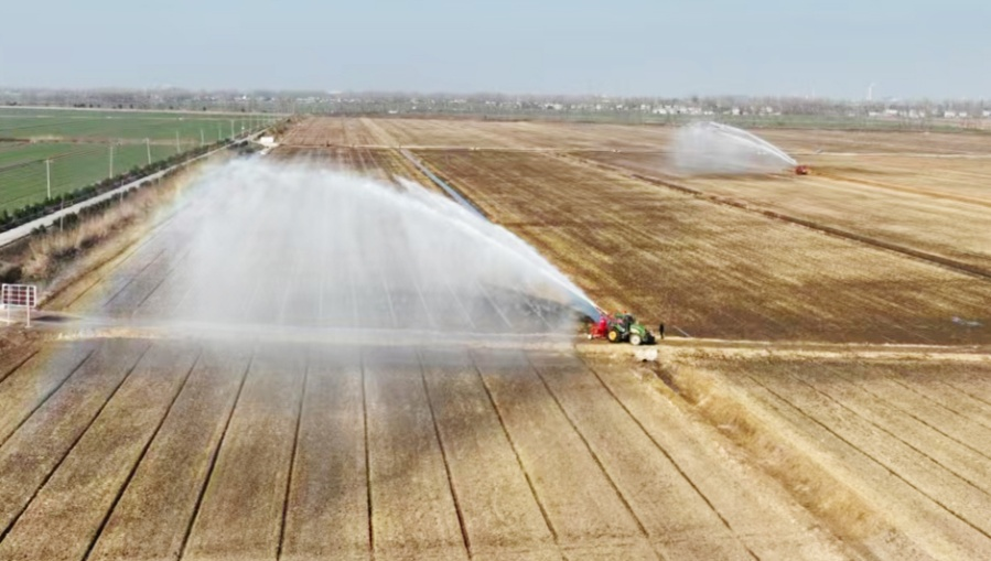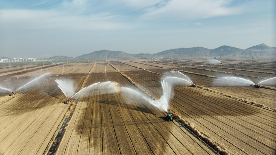 東風湖農場緊急啟動全面噴灌抗旱作業。一邊組織4臺挖掘機清理溝渠、疏通水路、調度水源;一邊投入14臺套大型噴灌機械每天15小時輪班作業,為小麥生長打牢基礎。(高俊兵)