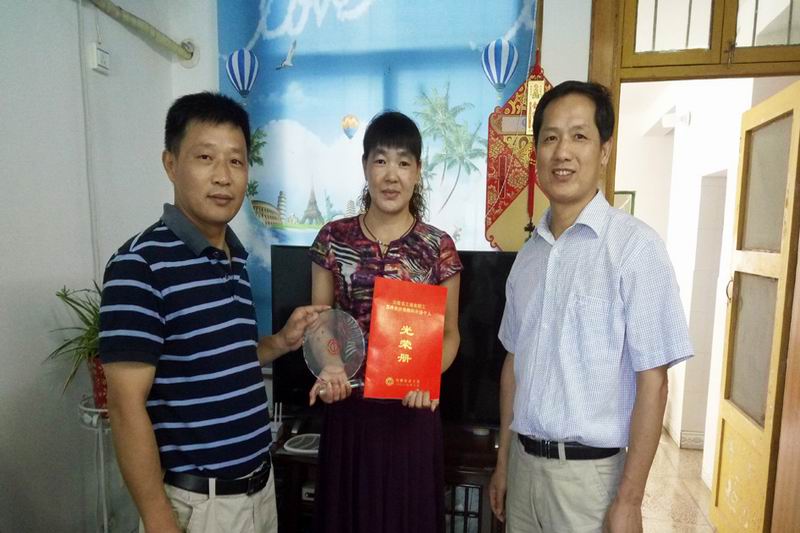 628,華陽河一場黨政領導走進職工唐萍家中,代為頒發省總工會授予的職工文明家庭獎牌和光榮冊。