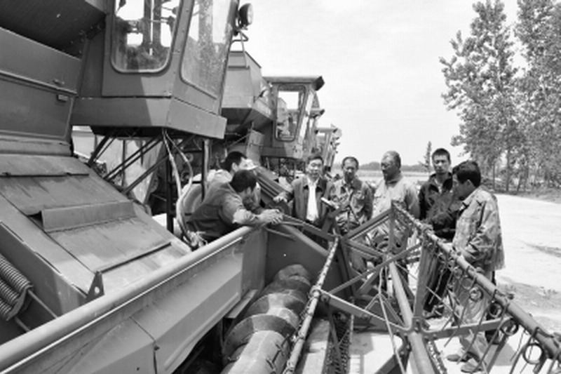 安徽農墾潘村湖農場麥收時節,260多臺大馬力收割機已檢修完畢全部投入一線。連日來,農場組織資深農機人員進村入戶,現場培訓收割機手,以進一步提高機手操作水平,確保顆粒歸倉。圖為農場高級工程師汪長銀正在為機手講解收割機操作規程。(楊登宏攝)