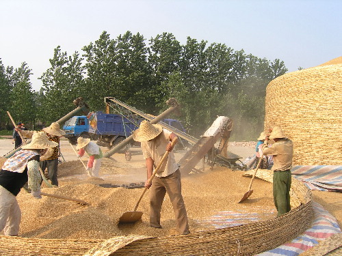 7月10日下午,在安徽省潘村湖農場五分場曬場,種子公司職工正在緊急轉運儲存在這里的小麥種子糧。
