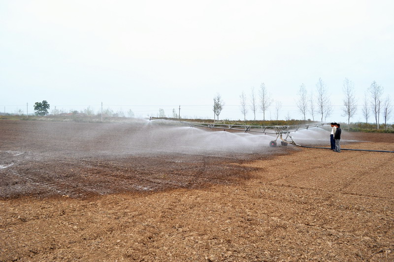 1024,安徽農墾潘村湖農場二分場的職工家庭農場正利用大型絞盤式噴灌機為麥田澆水。針對今年秋種以來出現的持續無雨天氣,該農場的職工家庭農場利用各種灌溉設備為已播小麥的大田澆水,確保苗齊苗壯、安全越冬。(安徽日報20131026A2版,楊登宏攝)