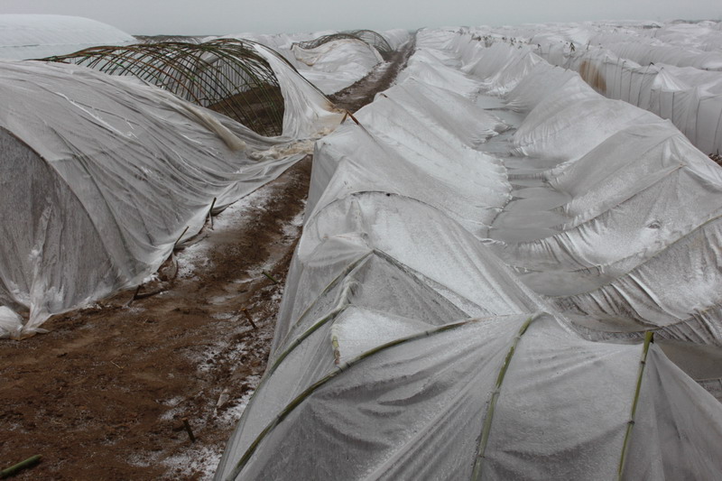 災情發生后,農場積極應對。3日上午,場長主要領導及時趕往現場。從檢查情況看,一是受損設施竹架大棚以整棚毀損居多,竹架攔腰折斷,難以修復。二是棚內西瓜、辣椒苗損失嚴重。被毀大棚內的果蔬苗,由于大棚倒伏,時間一長必將遭受凍害。場長王國福要求,現在當務之急,就是清除棚上的積雪積水,并要加固大棚,做好防范工作,防止夜里再降雨雪。同時做好雪中和雪后防寒防凍工作。并要求積極行動起來,應對災情,開展生產自救,盡量減少損失。