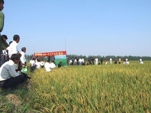 觀摩會上,“綠旱一號”水稻育種人朱啟升及各位水稻專家分別介紹了“綠旱一號”高產栽培技術、在江淮分水嶺地區的節水高效栽培技術研究情況、壽西湖農場抗澇栽培生產經驗、龍亢農場大面積機械化高產栽培經驗、栽培注意事項等情況,種業部門領導介紹了“綠旱一號”的生產及銷售情況,并展望了良好的銷售前景。