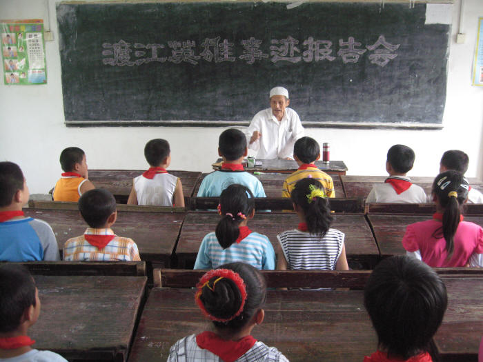 今年9月是穆斯林傳統齋月,也是全國民族團結進步宣傳月,皖河農場開展了以“唱紅色歌曲、聽革命故事”為主題的宣傳活動,把“當地回民船工護送大軍過長江”這一段歷史作為身邊的活教材,對回族兒童進行愛國主義教育。圖為渡江戰斗英雄、85歲的回族老人馬兆美在馬店回民小學向孩子們講述渡江戰斗故事。