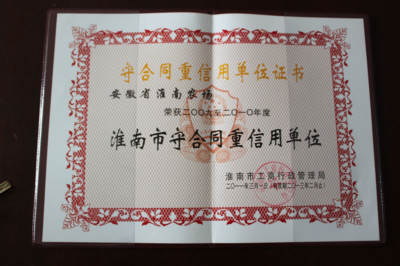 淮南農場連續(xù)六年獲市級“守合同重信用單位”稱號