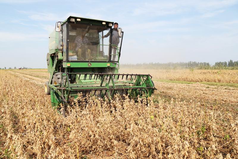 圖為華陽(yáng)河新洲管區(qū)用大型收割機(jī)收獲大豆。(李龍)