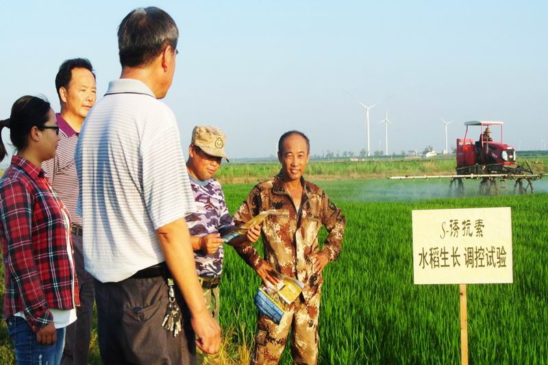 華陽河農場今年引進水稻“S-誘抗素”套裝新藥劑,近日,農科所選擇在二場水稻種植大戶中進行田間試驗。