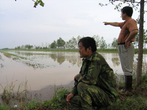 圖為潘村湖農場二分場職工李家軍兄弟在自家責任田前察看澇情。(楊登宏攝)