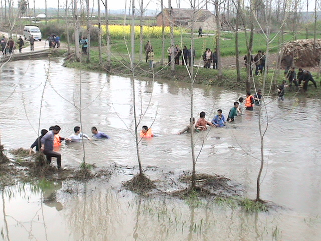 事件發生后,周圍群眾在第一時間內趕往救援,搜救隊伍不斷擴大,從幾人發展到幾十人、最后擴大到兩三百人。搜救過程中,明光市張八嶺派出所民警也趕到現場,參加緊張的救援工作。搜救人員分成多組,一部分人在上游用魚網拉尋;另一部分人在下游攔截,清理河道雜草,開挖新的泄洪口,增加泄洪量;還有一部分人沿河道巡查搜索。到下午3時許,仍沒有結果,搜救隊伍又組織10多名突擊隊員,拉著繩子下河,冒著可能沒頭的危險,組成人墻在水中排查,到3時25分, 杭世江的遺體被打撈出水面,距離落水時間已經超過兩個小時。