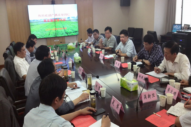 1010,廣西農墾局土地資源管理部門及西江房地產開發建設有限公司一行8人到安徽農墾考察交流土地管理、房地產開發、墾地合作等工作,安徽農墾集團副總經理程軍率土地建設規劃部、經濟合作開發部、通和房地產集團及宣城公司、皖墾茶業集團負責人參加了座談交流。(萬亮)