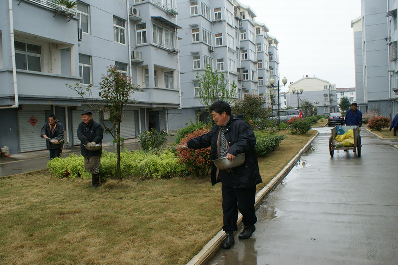 44,在清明節小長假之際,大壙圩農場東方物業公司全體員工冒著綿綿春雨,正在東方花園職工小區綠化園里撒施肥料,忙著辛勤護理花草樹木。
