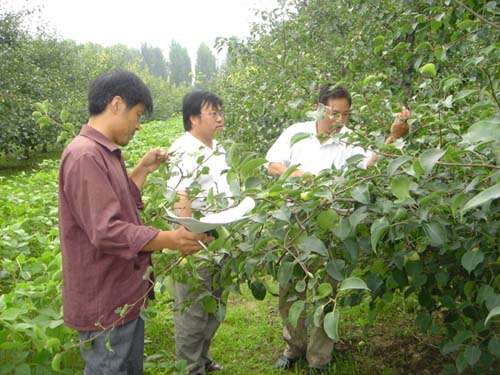 此次檢查共分6組,重點檢查內容:疏果、病蟲防治及果園衛生。采取定點抽查,百分制記分法。全場共查62個園片,328株梨樹。