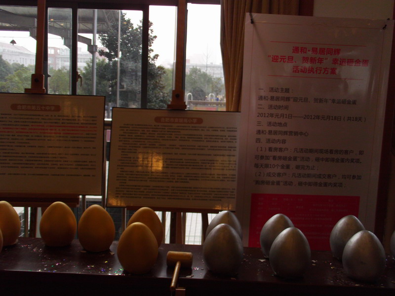 2012年元旦佳節期間,安徽農墾通和房地產集團合肥公司舉辦了通和·易居同輝項目系列促銷活動?;顒俞槍捶靠蛻?、成交客戶設置了兩類“幸運砸金蛋”:首次看房并登記信息的客戶可通過槌砸“金蛋”獲得獎品;購房成交客戶則可通過槌砸“金蛋”獲得現金獎勵沖抵房款。此外,該公司還利用節假日主動“走出去”,到合肥市主要社區和商業繁華地段派發項目推介廣告單頁。