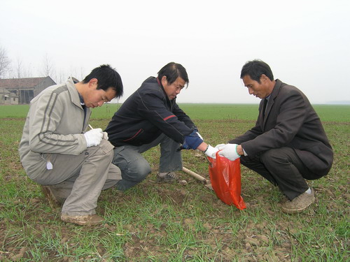 2005年午季,地處淮河之濱的潘村湖農場部分田塊發生罕見的小麥吸漿蟲災害,當年有數百畝小麥減產幅度很大。2006年,該場在省市植保部門的指導下,制定了周密的防治方案,有效地遏制了小麥吸漿蟲的爆發態勢,全場3.2萬畝小麥平均單產歷史性地達到940斤。為徹底根除小麥吸漿蟲,從11月底開始,該場組織農技人員在全場80多塊條田挖取土樣近500份,按有關技術規程進行淘土調查以確定蟲情,制定相應的防治措施。圖為12月5日上午,農場技術人員正在一分場大田采取土樣的情景。(楊登宏攝)