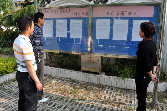 429,在潘村湖農場場部宣傳公告欄前,幾名職工正在觀看創先爭優公開承諾專欄。