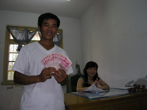 8月4日上午,潘村湖農場一分場職工谷忠明(左)從場財務科領到了2050元獎金。針對近年來夏大豆市場價格持續走低,耕地畝均收益較低,職工增收緩慢的情況,潘村湖農場不斷加大農業結構調整力度,在鞏固小麥種子糧生產的同時,以市場為導向,積極發展優質、高產、高效的調秋作物,促進職工增收,并將2006年確定為“結構調整年”,出臺了一系列扶持和激勵措施,在技術、資金和產品銷售等方面給予支持。今年夏種期間,在場農技部門的指導下,谷忠明等幾戶家庭農場引進旱稻新品種在大田進行連片種植,預計畝均效益較種植大豆提高近一倍,為全場秋季作物結構調整起到了示范帶動作用。根據場有關鼓勵結構調整規定,農場按每畝50元的標準對結構調整示范戶給予了獎勵。(楊登宏)