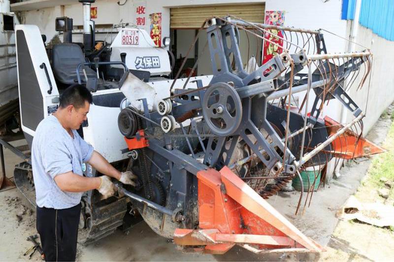 周支援是位農機修理師。他在家門口開了一間機修鋪,隨著午收臨近,他的生意越來越忙。他告訴筆者,從4月中旬開始,來檢修機械的人越來越多,有時一天要檢修3、4臺,大家為的是午收時省心、省時、省力。