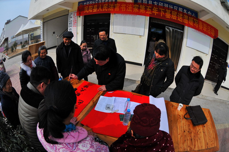 216,春風送暖,陽光明媚。方邱湖農場社區辦門口,三張八仙桌一字排開,鳳陽縣人民法官書法家第五年下基層送溫暖寫春聯活動在這里傾情舉辦,該院副院長張國云等4位法官不辭辛苦,書寫不輟。從早晨到午后,農場社區職工居民滿心喜悅地排隊等候著人民法官現場書寫的春聯。