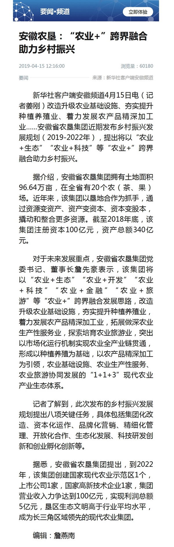 4月15日新華社客戶端要聞?lì)l道報(bào)道《安徽農(nóng)墾:“農(nóng)業(yè)+”跨界融合助力鄉(xiāng)村振興》,報(bào)道截圖如下: