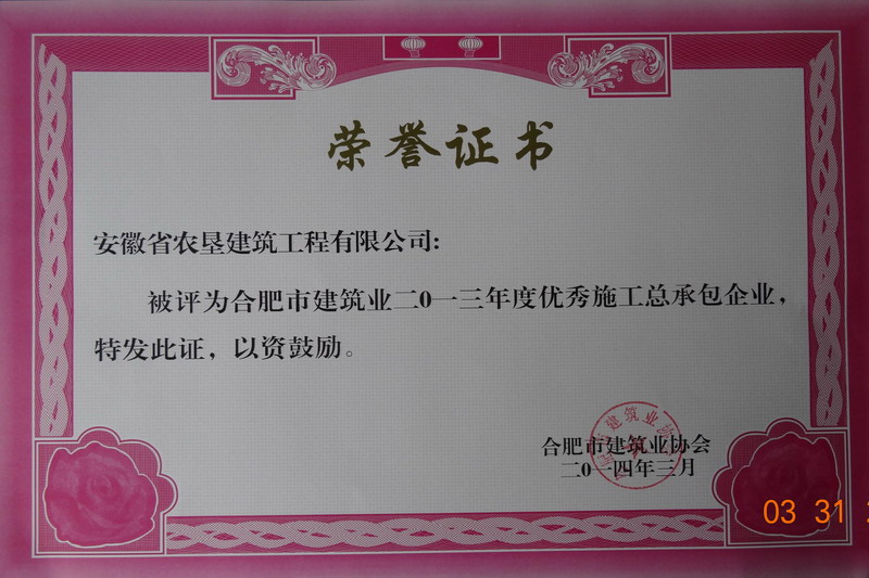 328下午,合肥市建筑業協會舉行常務理事會暨理事大會,表彰了2013年度全市建筑行業優秀企業及單項先進。墾建公司獲評優秀施工總承包企業統計管理先進企業兩項殊榮,項目經理蘇芳芳榮膺安全管理先進個人。